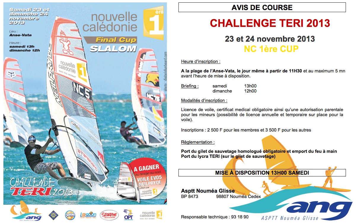 L’ANG avec le concours de NC 1ère vous donne rendez-vous ce weekend 23 et 24 novembre à l’Anse-Vata pour la dernière étape du challenge TERI 2013 qui consacrera le windsurfeur de la saison !
