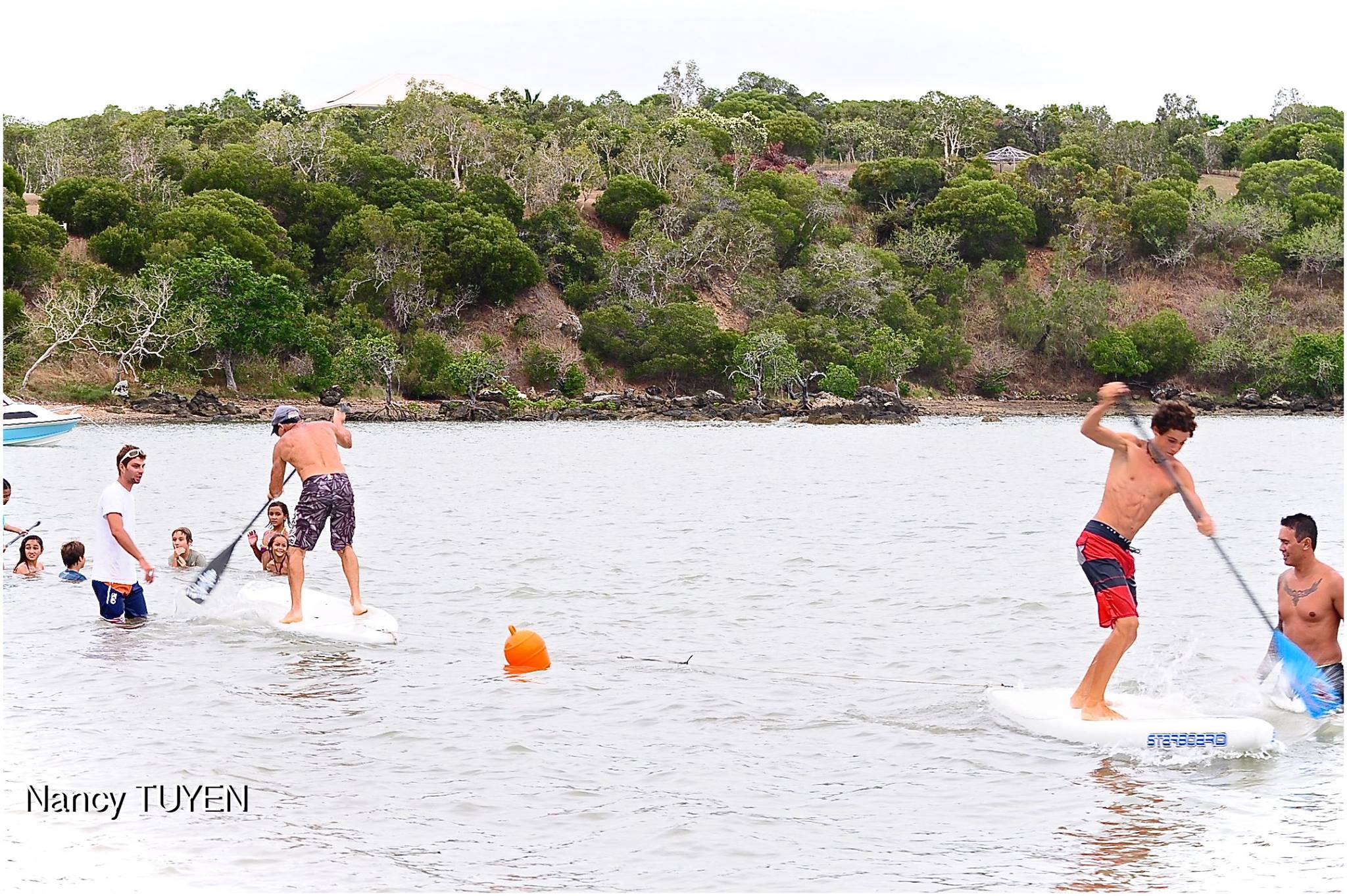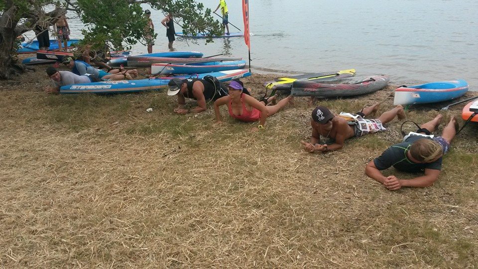 Et comme Emilie n’est jamais à court d’idées (on lui pardonnerait PRESQUE de nous avoir « torturés » sur la ligne de départ des courses techniques), une nouvelle épreuve a terminé la journée du samedi : le « one versus one » : deux planches reliées par une corde, une bouée au centre, deux supeurs dos à dos, le premier qui fait passer la bouée à l’autre (ou passer l’autre à l’eau !) a gagné !