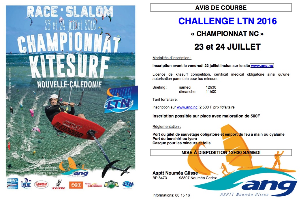 Sous la tutelle de la ligue Calédonienne de Vol Libre, l’ANG organise les 23 et 24 juillet au Méridien le championnat de Nouvelle-Calédonie de Foil et Open 2016.